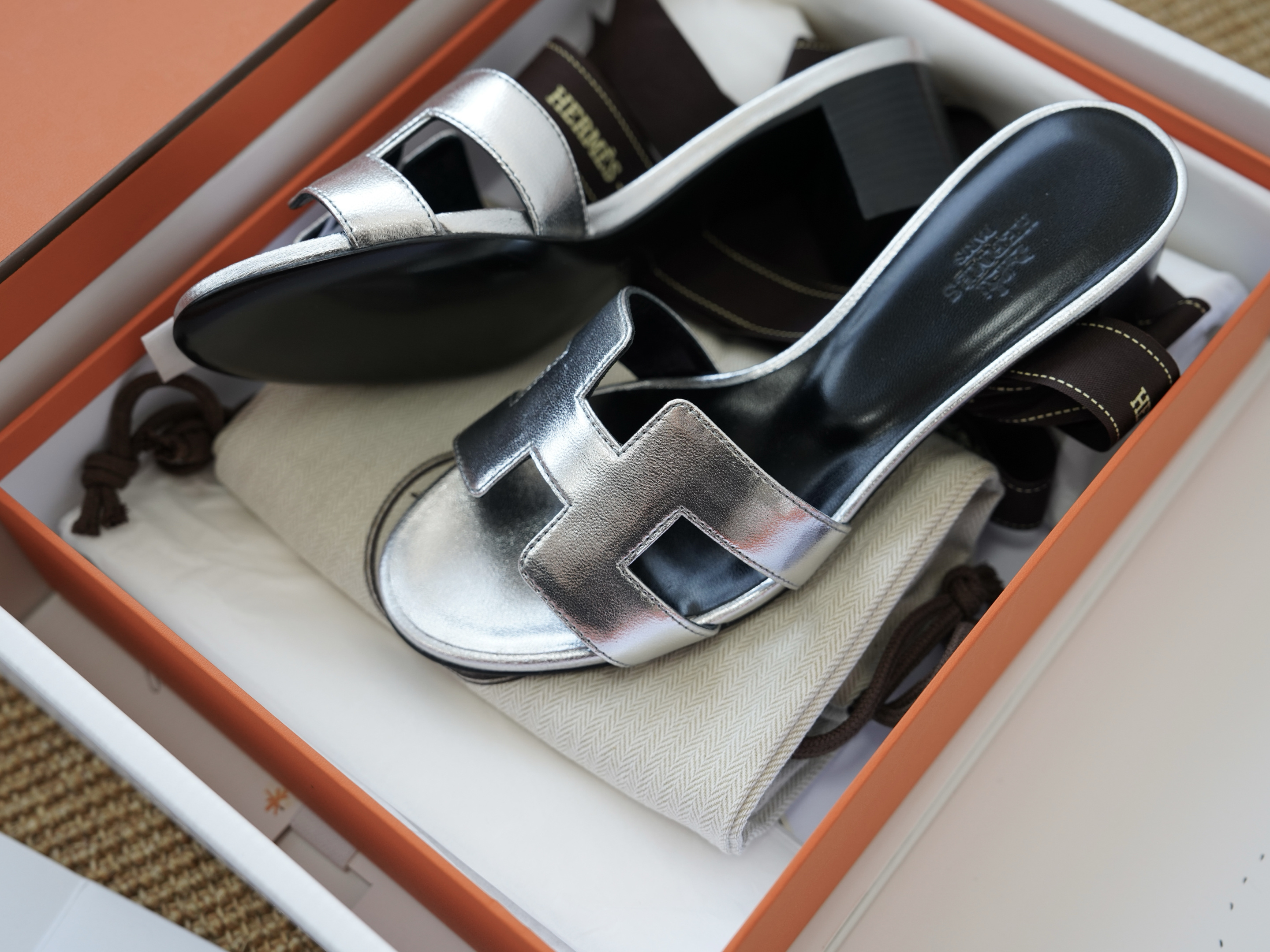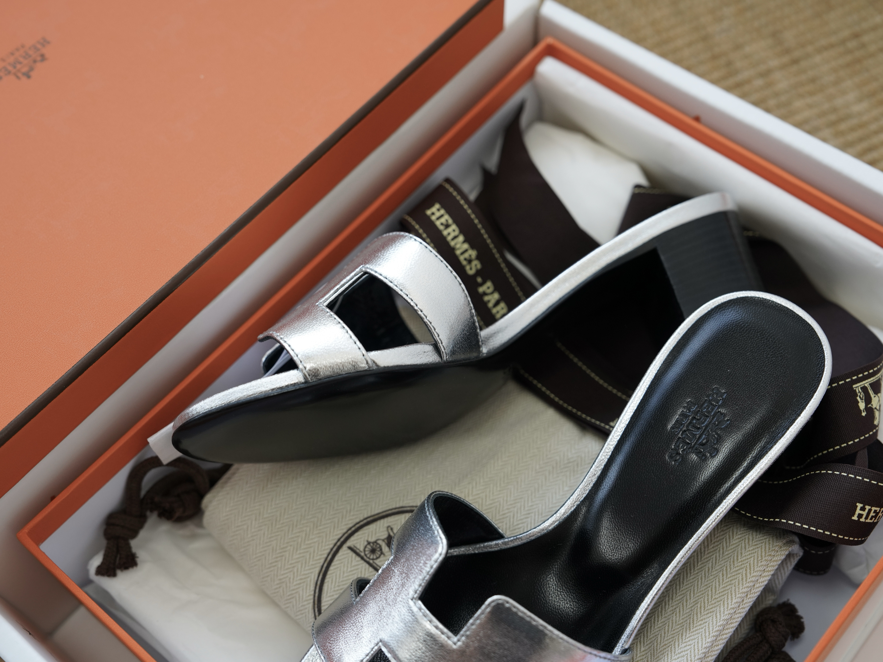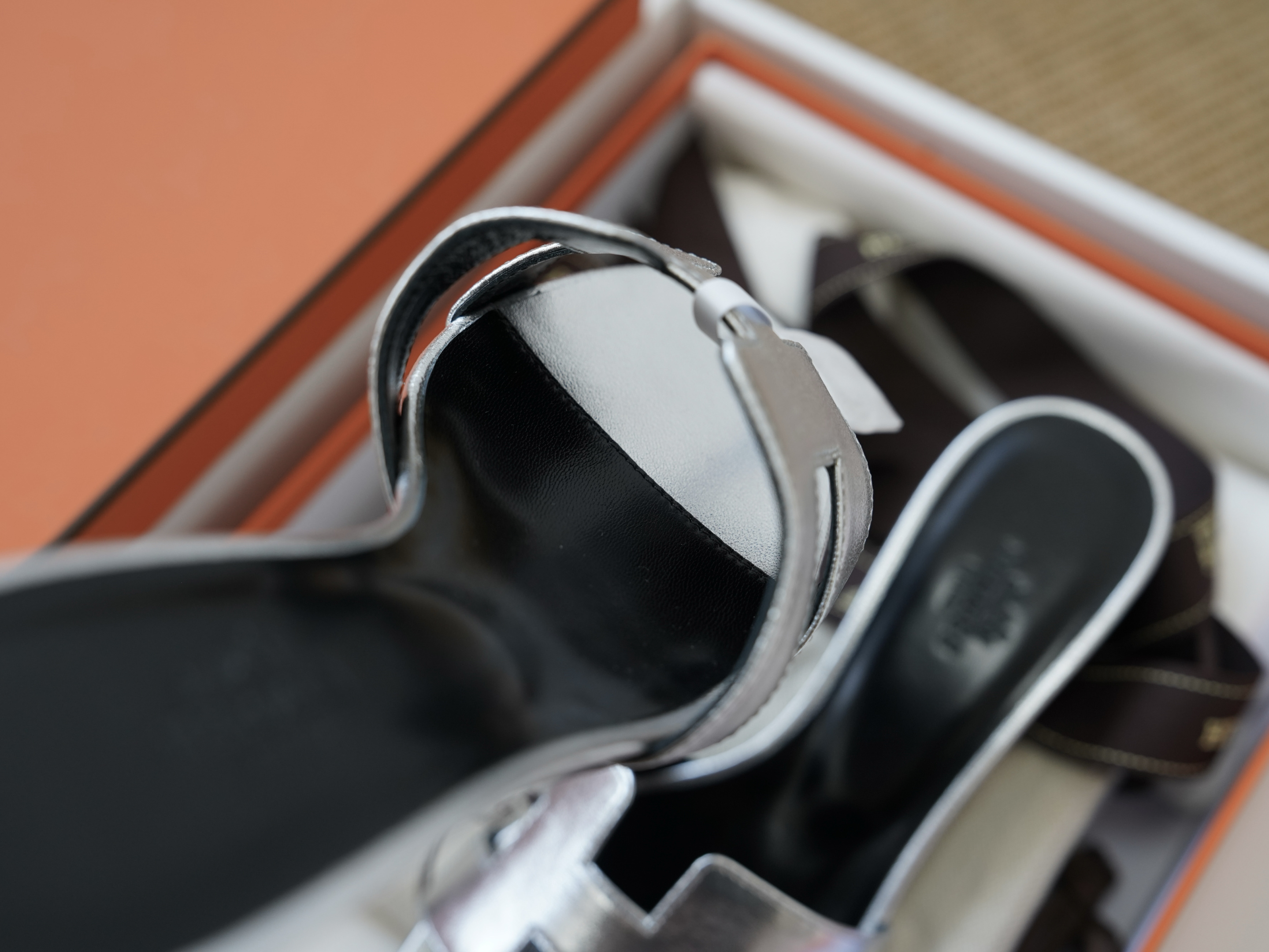 Эти элегантные шлепанцы представлены также в металлическом серебристом цвете, который идеально дополняет любой гардероб.
