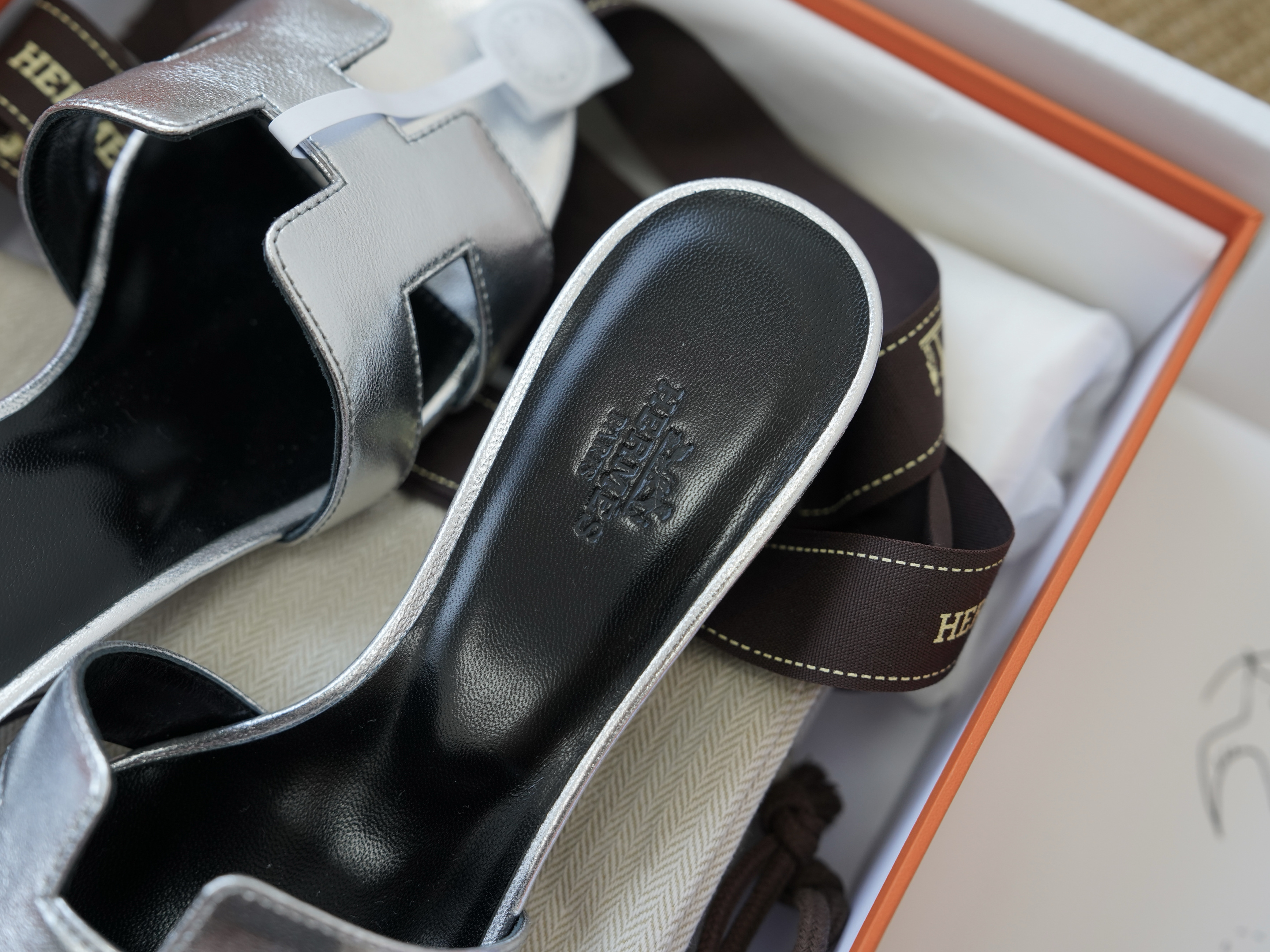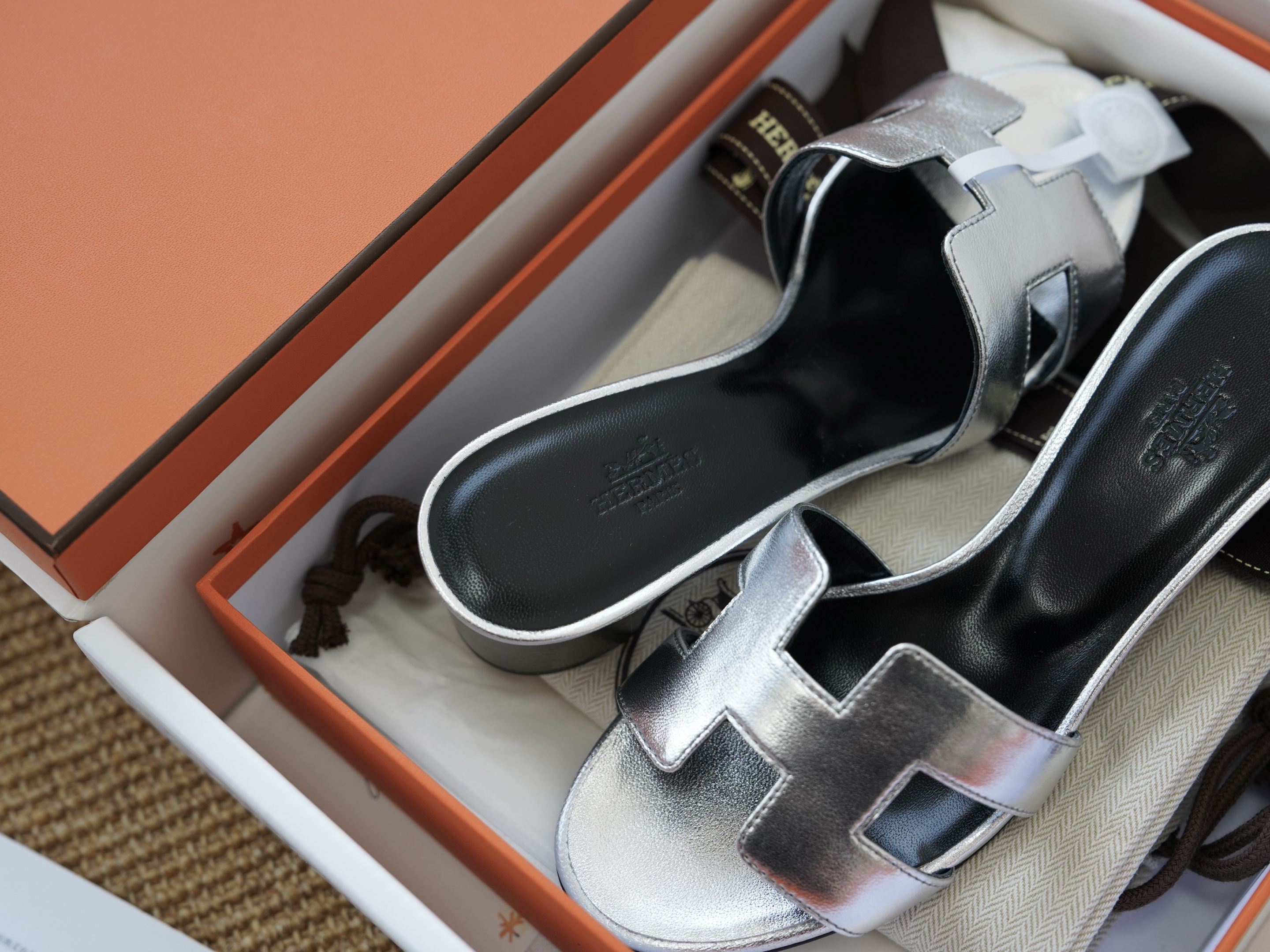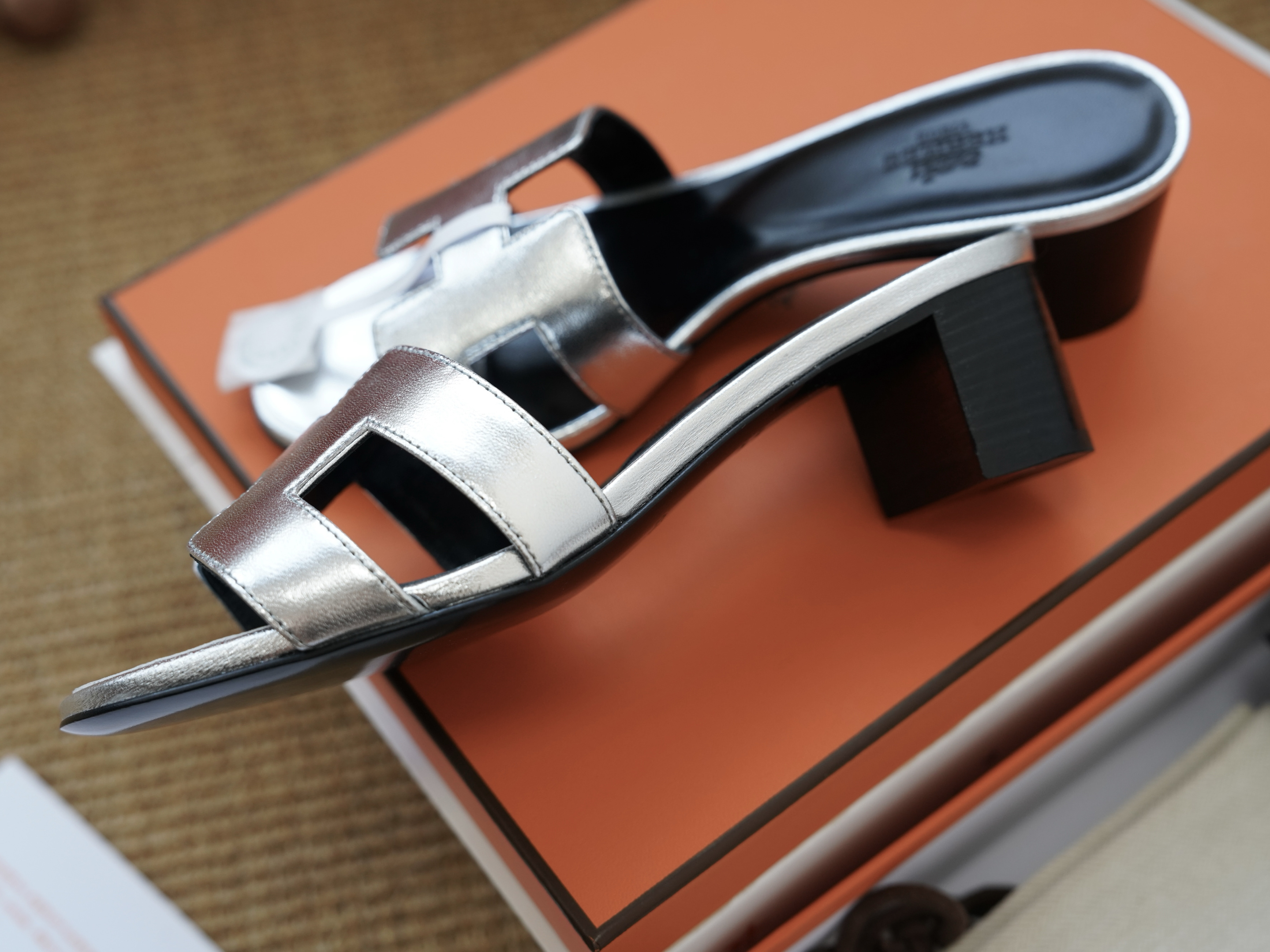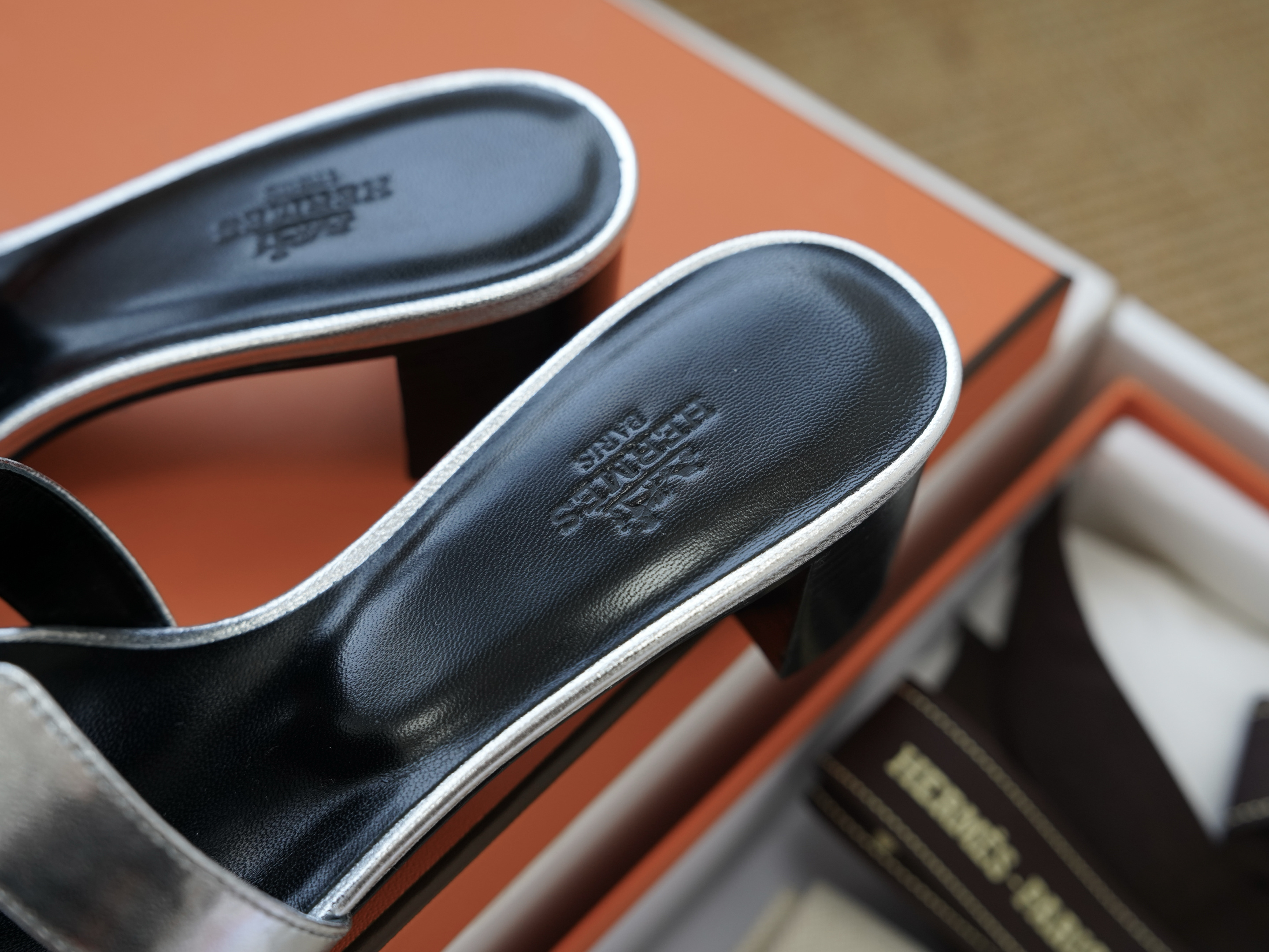 Эти элегантные шлепанцы представлены также в металлическом серебристом цвете, который идеально дополняет любой гардероб.
