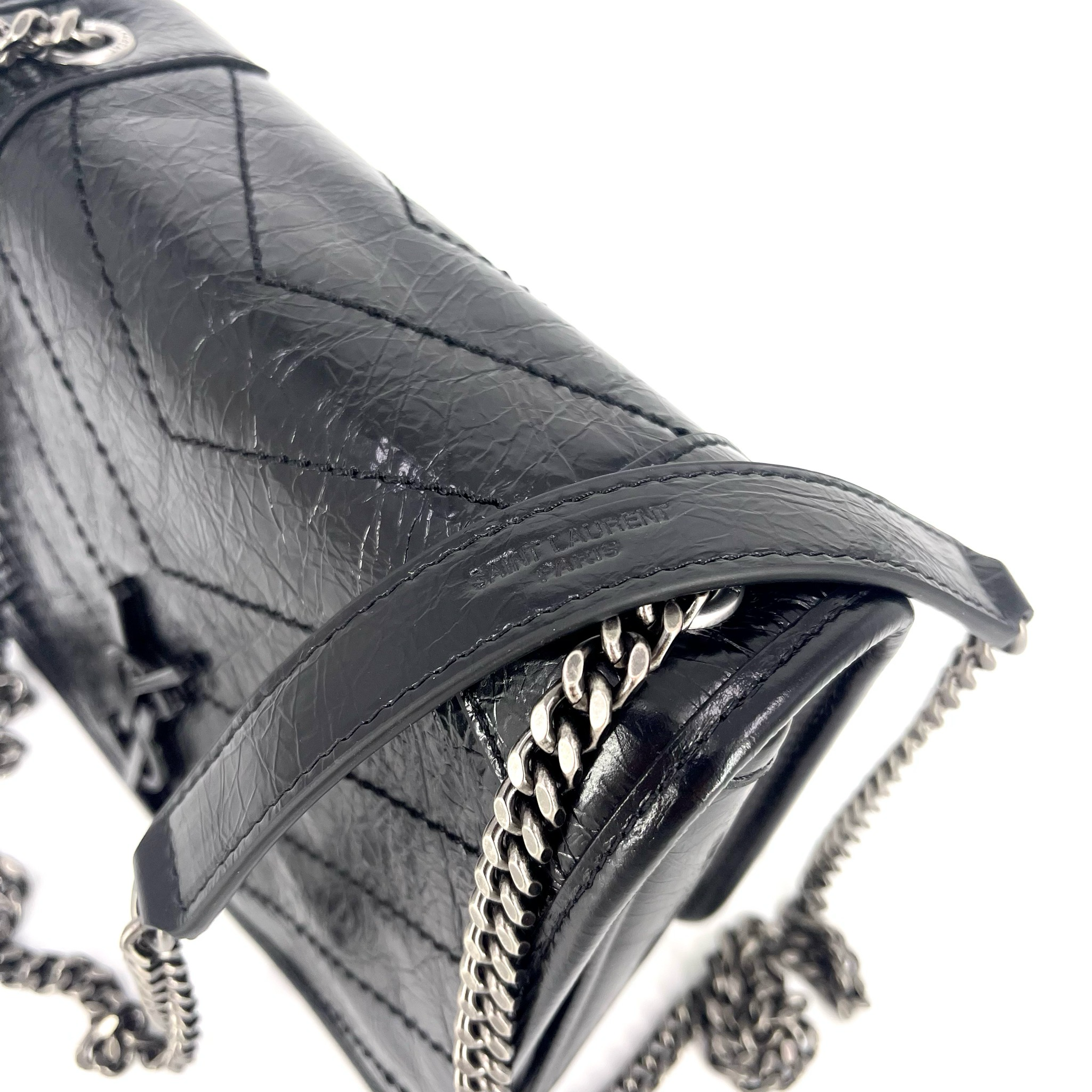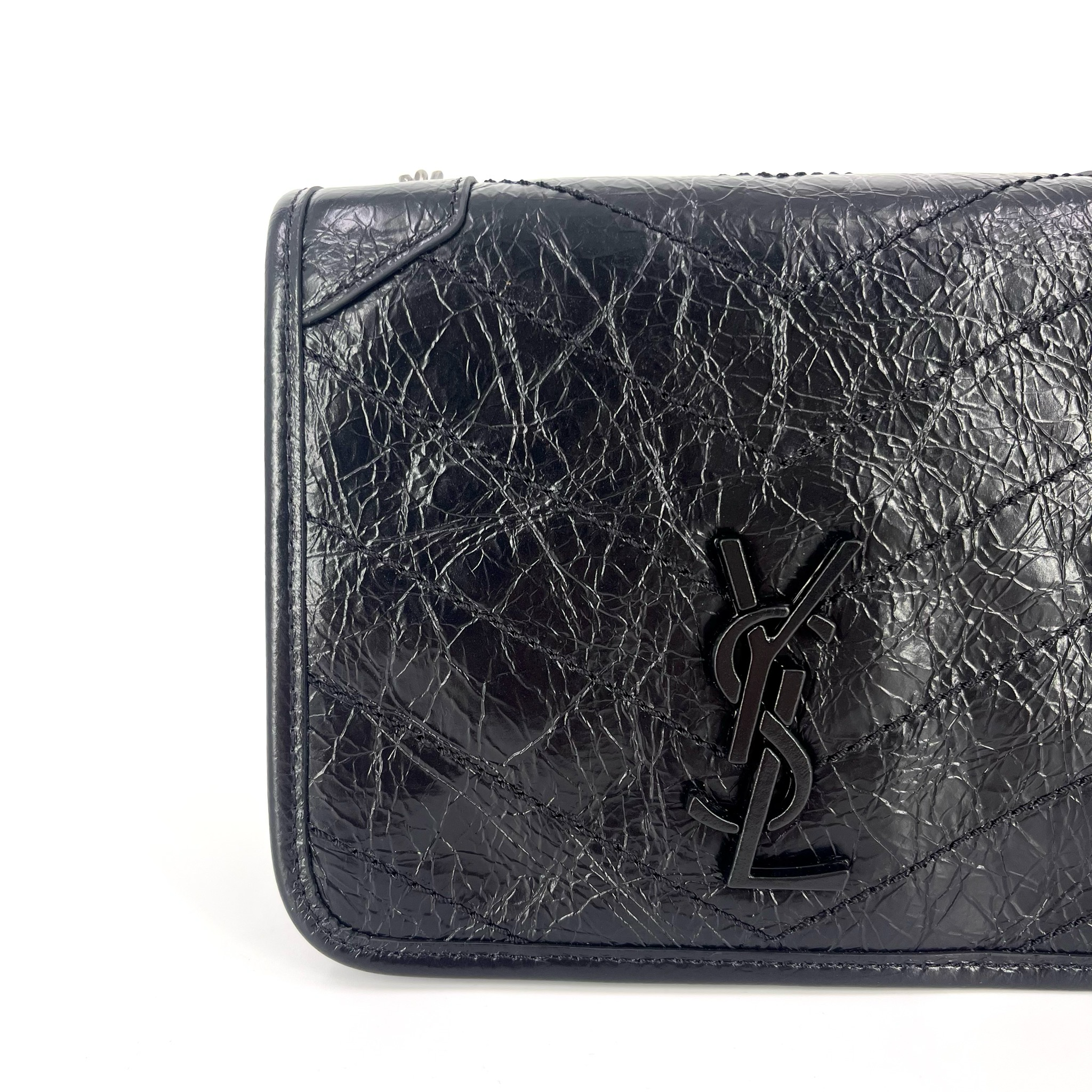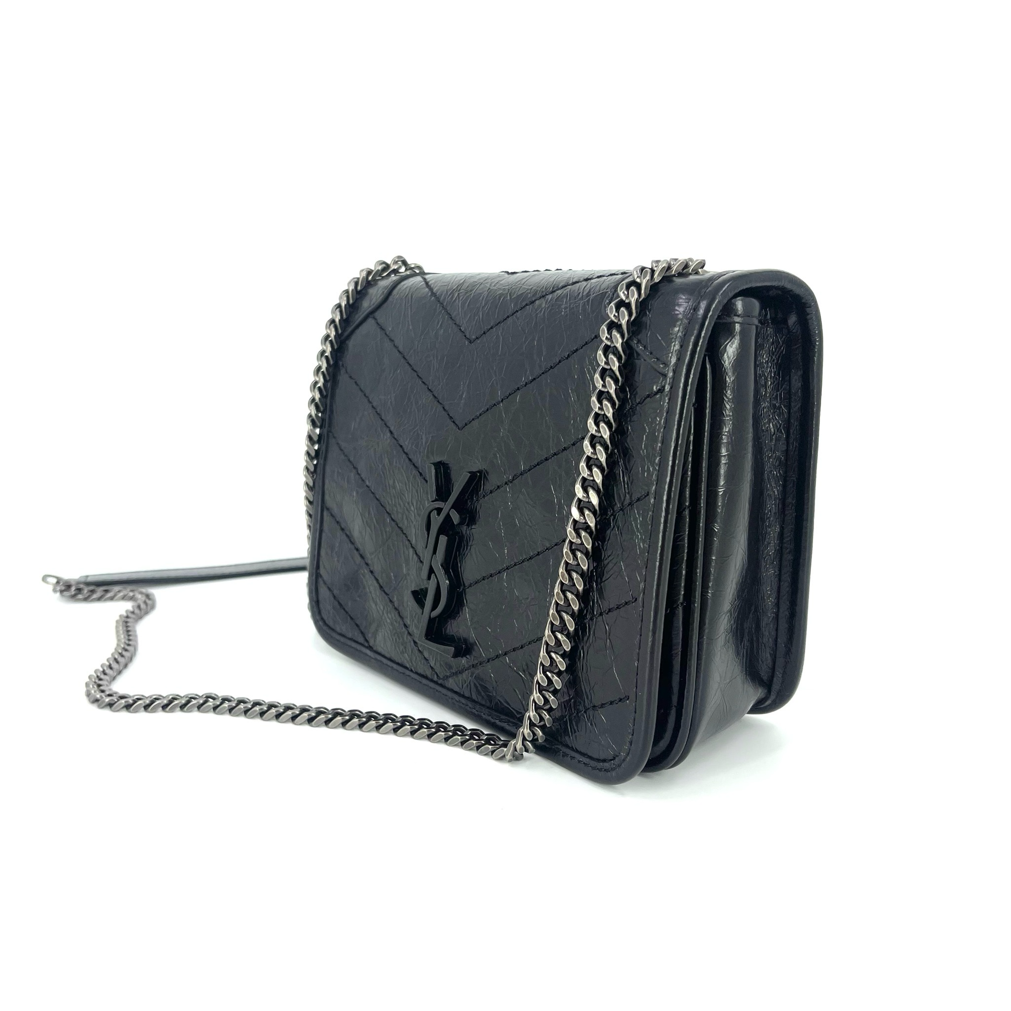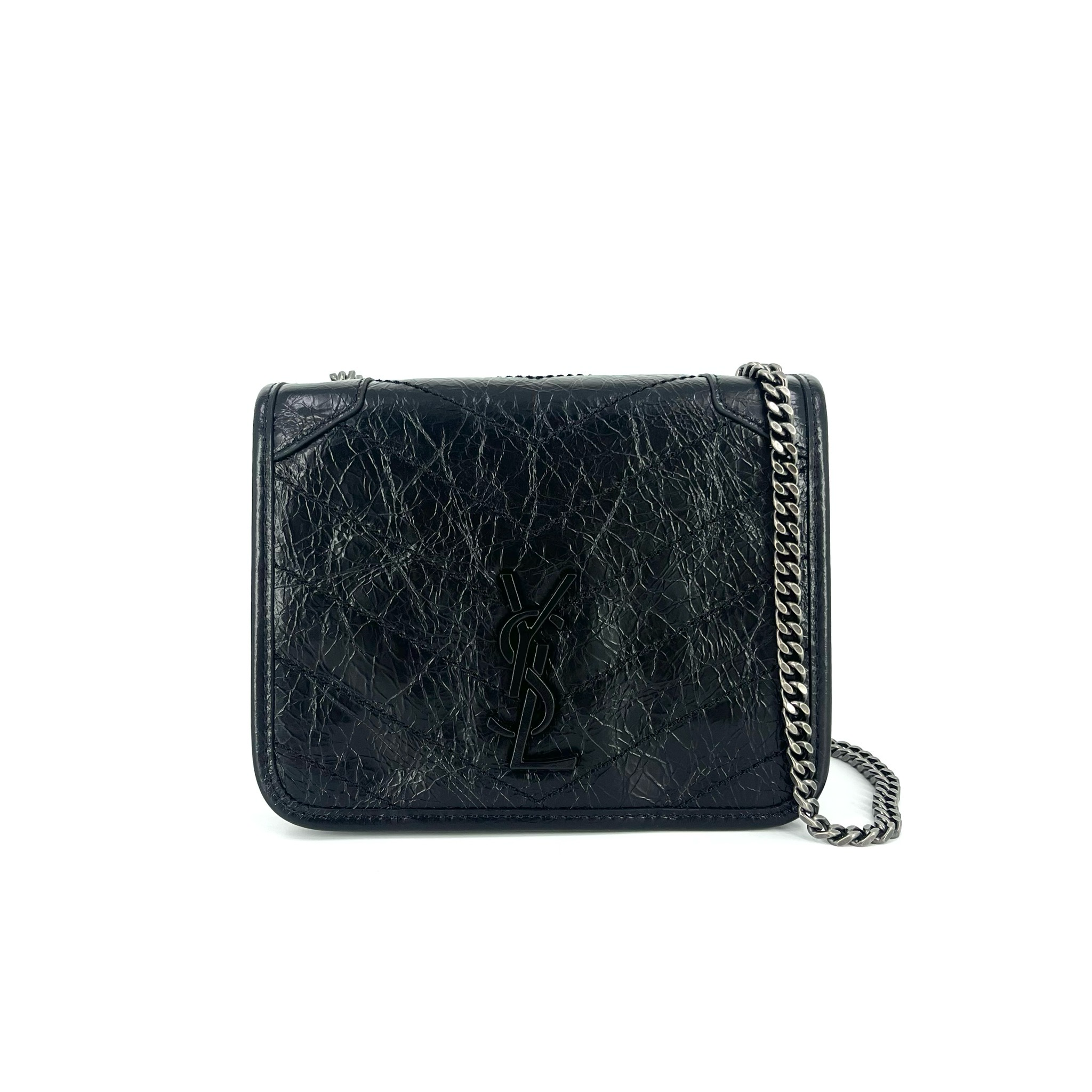 Saint Laurent Niki Chain Wallet Vintage стильная сумка от известного французского бренда, выполненная из высококачественной кожи черного цвета. Благодаря своим компактным размерам (18,5х14х6см) она легко поместится как в руке, так и через плечо. Фурнитура серебряного цвета добавляет элегантности этому изделию. Эта модель идеально подойдет тем, кто ценит качество, стиль и удобство.